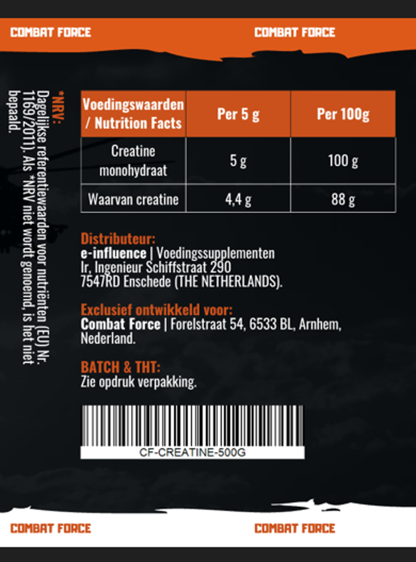 Vergroot je explosieve kracht, bouw spiermassa en herstel sneller met Creatine van Combat Force. Deze pure en effectieve formule voorziet je spieren van maximale energie, zodat je zwaarder kunt trainen en elke set verder kunt pushen.
